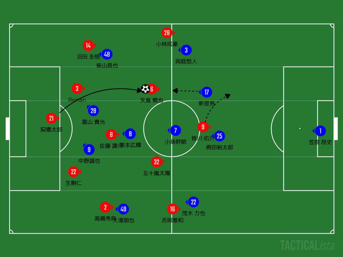 そしてゴールシーンについても相手に押し込まれたところから、皆川についた新里、小林についていた岡庭に対して、皆川のポストプレー→矢島がワンタッチで岡庭・新里の裏へスルーパス→小林がスピードを生かしてペナルティエリア侵入。反対サイドの吉岡もエリア内へ入ったところでのこぼれ球を矢島が仕留めたものでした。