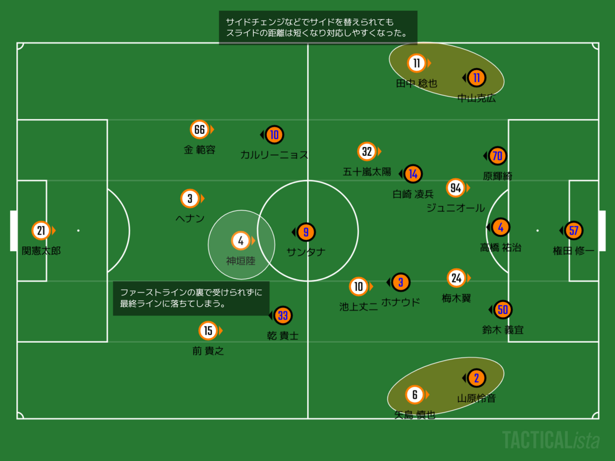 RSHに入っていた中山をRWBにし、後ろで5レーンを埋めてきました。また前線もボールの出どころになっていたRSB前のサイドに乾をもってくることでカルリーニョスよりもプレス強度を上げます。